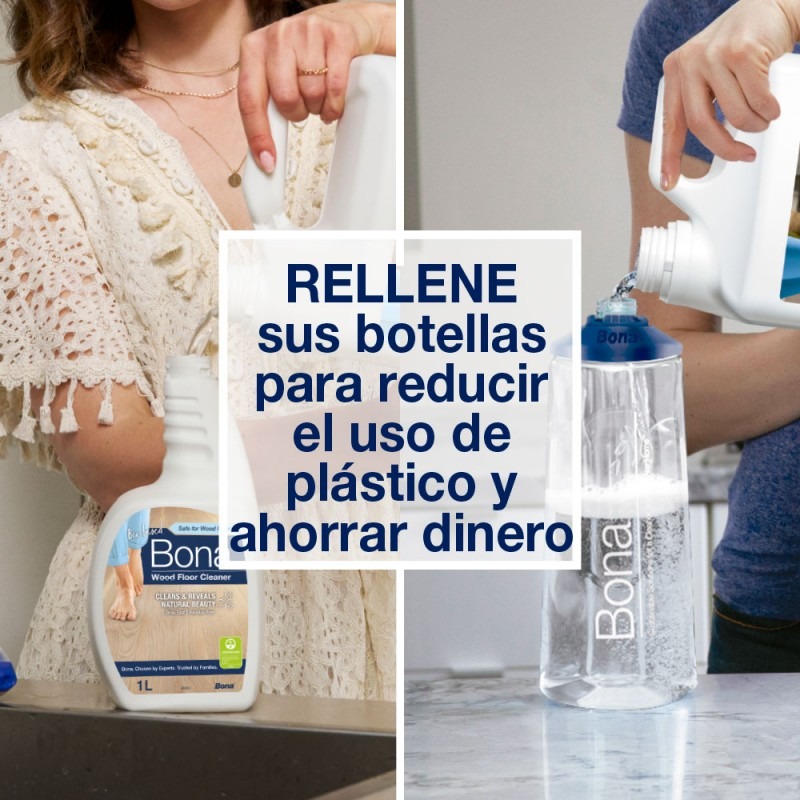 El Limpiador de Suelos de Madera Bona en formato económico puede utilizarse para recargar tanto la botella recargable de la Bona Spray Mop Premium